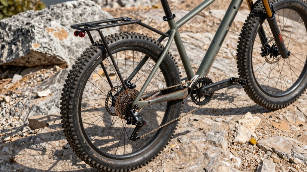 Mounting racks on wide-tire bikes often presents unique challenges because the increased tire width can interfere with attachment points and clearance. You may find that traditional racks don’t fit well, risking contact with the tires or damaging delicate frame paint. Color matching rack components can be tricky, especially if you want a seamless look. Additionally, frame paint may chip or peel when installing or removing racks due to tight clearances. You might also encounter: