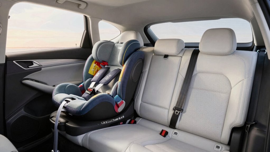 You’ll love how rear child seats turn your world into a secret fortress, hiding your little one and limiting driver visibility. Seat accessibility becomes a puzzle, and you’ll often struggle to keep an eye on your kiddo. Meanwhile, front seats offer the gift of unobstructed views—so you can monitor your child easily and feel like a responsible driver, not a magician trying to see through a fortress of car seats.