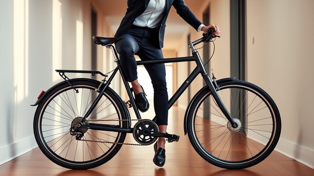 Imagine effortlessly switching from desk to bike in seconds—that’s where quick outfit swaps and versatile layering come in. You simply remove your blazer and tie, then layer a moisture-wicking shirt or jacket underneath, revealing a sleek, bike-friendly look. Keep your shoes versatile, like slip-ons or stylish sneakers, so you can quickly shift. With these simple tricks, you stay prepared and stylish, no matter where your day takes you.