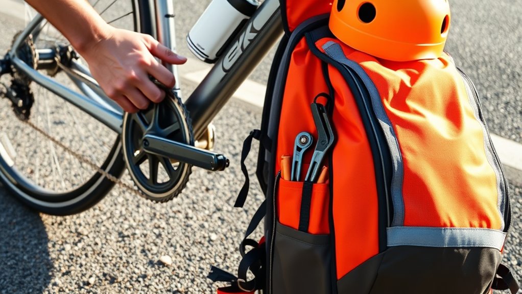 You’ll want a good multi-tool, tire pressure gauge, and a pump to keep your bike in top shape. Don’t forget safety gear like lights, reflectors, and a helmet—because even the best bike maintenance can’t fix careless safety. These tools help you spot issues early, ensuring a smooth ride and avoiding the dreaded breakdown or accident. Remember, proper tools and gear are your best friends on every adventure!