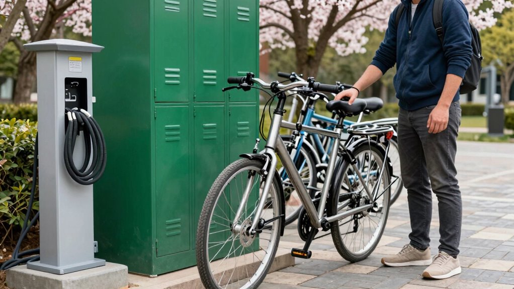 Using these designated spots helps keep your e-bike secure and prevents blocking pathways. Always verify that the spot is meant for charging to avoid inconvenience. Recognizing appropriate charging locations is crucial for an efficient and stress-free experience, especially when considering campus power outlet availability. Being aware of electric bike charging etiquette helps ensure you follow campus policies and respect fellow students. Additionally, understanding campus electric vehicle policies can help you stay compliant. By choosing the right location, you ensure a smooth charging experience without drama.