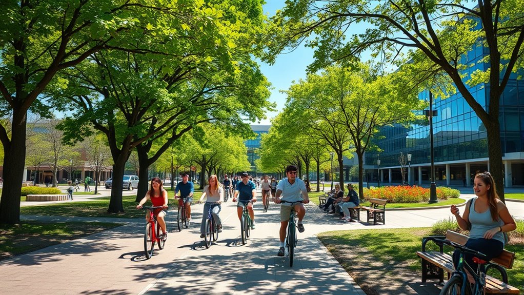 Yes, your campus has dedicated bike lanes and paths with clear bike lane signage, making it easy to navigate securely. These bike paths are regularly maintained to guarantee smooth riding and safety. Always stay on designated bike lanes, follow signage, and watch for any maintenance updates. Using these dedicated paths helps you avoid traffic and reduces the risk of accidents, making your campus biking experience safer and more enjoyable.