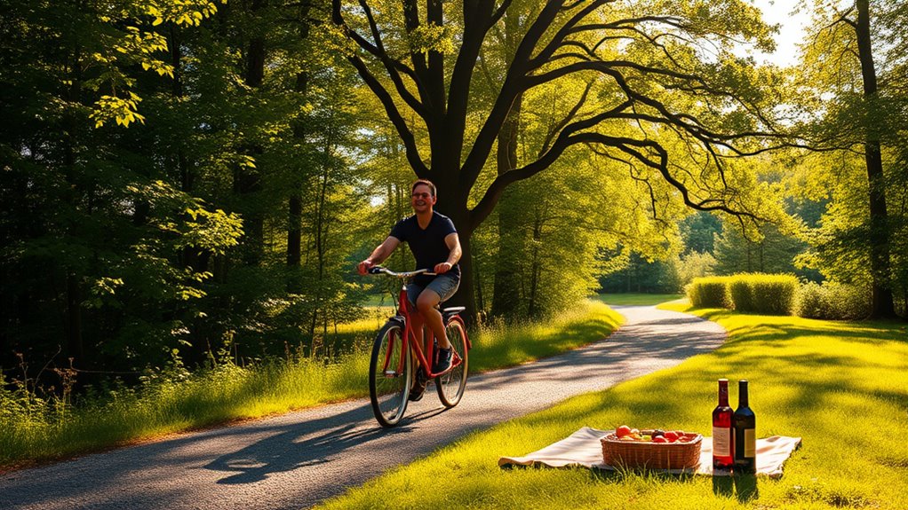 Cycling offers a fun and eco-friendly way to connect with your partner while exploring new places together. Whether you’re cruising through a scenic park or steering city streets, biking creates a relaxed environment perfect for conversation and shared experiences. Before heading out, make sure you prioritize bike safety. Wear a helmet, check your brakes, and verify your bike is in good working condition. Proper cycling gear isn’t just about style; it’s about safety and comfort. Bright, reflective clothing can help you stay visible, especially if your ride takes you through low-light areas. Padded gloves and comfortable shoes will make your trip more enjoyable, reducing fatigue and preventing blisters. A small repair kit and a water bottle are also wise additions to your cycling gear, so you’re prepared for minor fixes or hydration needs along the way. Additionally, understanding dark psychology tactics can help you stay alert and recognize manipulative behaviors from others during your outings, ensuring your safety and peace of mind.