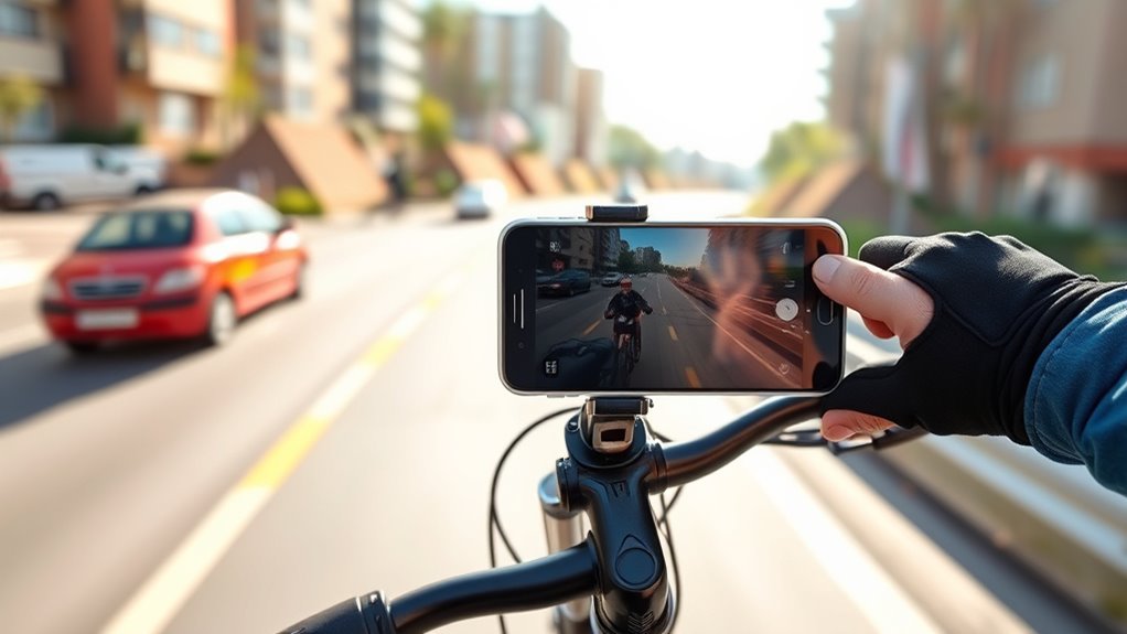 Finally, consider using accessories like lanyards or tether straps as backup in case your mount fails. Always check your equipment before starting your ride to confirm everything is securely attached. Remember, safety comes first—your phone is a tool to enhance your experience, not a distraction that puts you at risk. By choosing the right mounting options and adhering to safety tips, you can enjoy capturing memorable moments from your bike without sacrificing your well-being. Stay alert, plan your shots in advance, and ride responsibly, knowing you’re doing your part to stay safe while exploring the world around you.