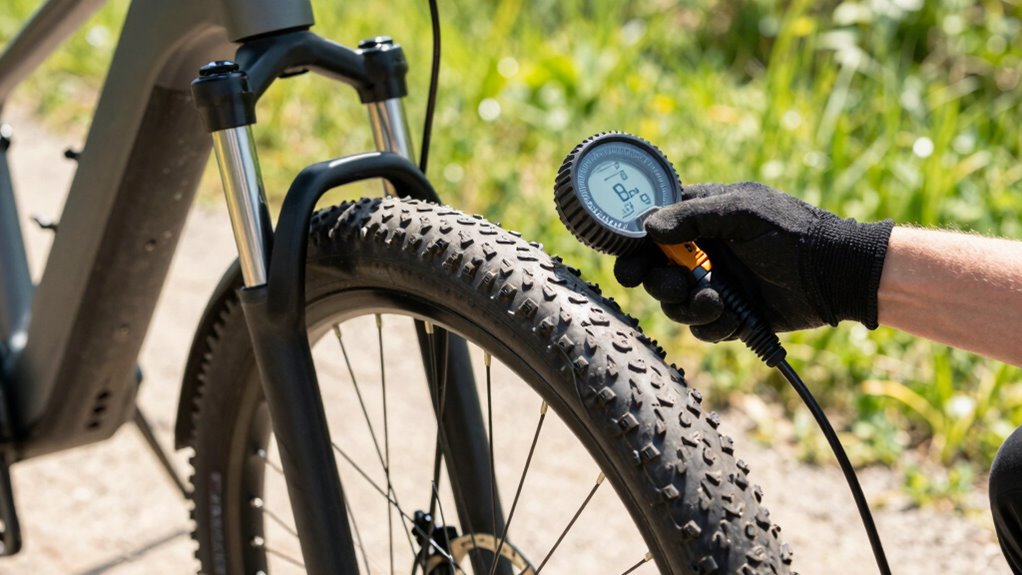 To keep your e-bike tires at the right pressure, make a habit of checking them regularly. Adjust the pressure based on the terrain you’ll ride to guarantee ideal performance and safety. Small, consistent adjustments make a big difference in ride quality and tire longevity.