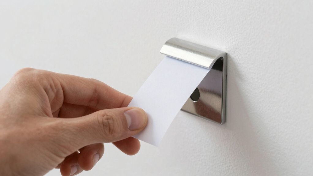 To guarantee paper stays flat during measurement, focus on paper stability and wall adhesion. Use a stiff, high-quality paper that resists curling. Press the paper firmly against the wall, ensuring it adheres smoothly without air bubbles or wrinkles. You can temporarily tape the edges to the wall to maintain stability. This simple step guarantees accurate results, making the process reliable for determining the correct saddle width.