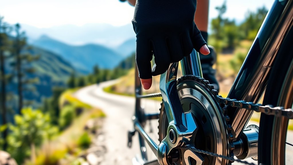 When you’re tackling steep inclines, you want to shift gears smoothly to maintain control. Start by easing off the pedals slightly, then shift to a lower gear before you feel resistance. Keep your cadence steady, avoiding sudden changes. As you ascend, stay in the gear that allows you to pedal comfortably without straining. Consistent, gentle shifts help you stay balanced and prevent chain slips or strain on your bike.