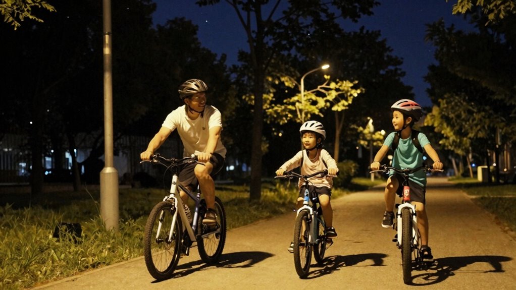 When unexpected situations arise during night rides with kids, stay calm and prioritize their nighttime safety. Communicate clearly and quickly, using simple instructions to keep everyone secure. Keep emergency preparedness in mind by carrying a flashlight, first aid kit, and charged phone. Reassure your kids, adapt your plans if needed, and maintain a steady pace. Clear communication and readiness guarantee you handle surprises confidently, keeping the ride safe and enjoyable.