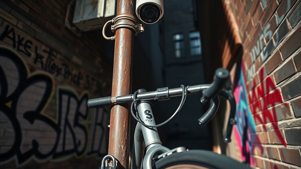 To prevent bike theft in high-risk areas, use a strong U-lock or hardened chain lock to secure your bike to a sturdy, immovable object, making it hard to cut or leverage. Combine this with visible security cameras and proper locking techniques, such as locking the frame and wheel tightly. These layered security measures signal to thieves that the risk outweighs the reward. Keep exploring for more tips to keep your bike safe.