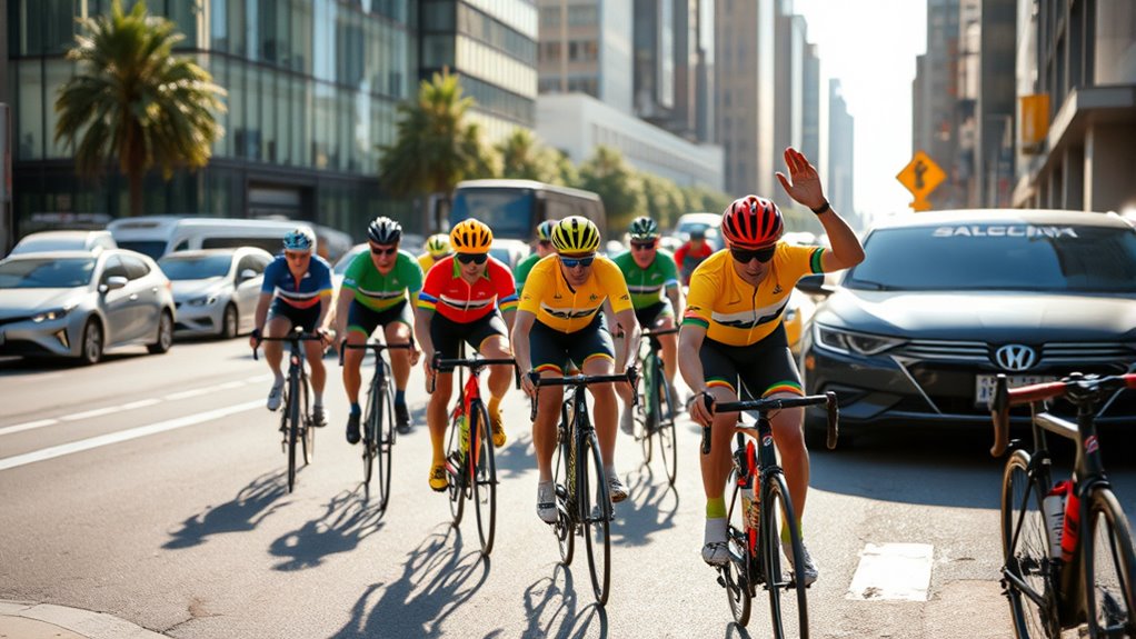 Group rides in traffic can boost safety and visibility for cyclists, but they require coordination and awareness. One of the most critical aspects of riding in a group is maintaining proper lane positioning. When you’re riding close together, you want to stay centered in your lane to avoid surprises from vehicles passing too closely. Proper lane positioning helps prevent accidents and makes your group more predictable to drivers. Keep an eye on the road ahead and adjust your position if the lane narrows or if there’s debris or hazards. Staying in a straight line and avoiding sudden swerves ensures that your group remains cohesive and reduces confusion for drivers. Additionally, understanding the divorce laws in your area can influence how you plan your routes and manage group rides, especially if legal separation or custody considerations are involved. Communication signals play a crucial role in maintaining safety during group rides. Before you start, agree on hand signals or verbal cues to communicate intentions, like turning, stopping, or slowing down. For example, a raised hand can indicate a turn, while a flat hand held out signals that the group is braking or stopping. Using clear, consistent signals helps everyone anticipate each other’s actions, reducing the risk of accidents. When riding, stay attentive to your fellow cyclists, and use these signals proactively rather than reactively. It’s also wise to assign a lead rider who is responsible for signaling turns and stops, and a sweep rider who ensures the rear stays aware of the group’s status. Positioning within the group can vary depending on the situation, but a common formation is a single-file line on narrow roads or when passing parked cars or obstacles. This formation allows for better lane control and reduces the risk of sideswipes. On wider roads or when traffic is light, riding two abreast can improve communication and make your group more visible to drivers. However, always stay aware of local traffic laws—some areas restrict riding two abreast or require cyclists to stay single-file in certain conditions. Effective lane positioning and communication signals also involve constant awareness of your surroundings. Keep your eyes open for approaching vehicles, road hazards, or changes in traffic flow. Use your signals early enough to give drivers and fellow cyclists time to react. Be predictable—avoid sudden movements or erratic riding, as this can confuse others and lead to dangerous situations. Remember, safety isn’t just about individual skill; it’s about working together, communicating clearly, and positioning yourselves thoughtfully on the road. When everyone adheres to these principles, group rides can be enjoyable, safe, and highly visible, even amid busy traffic conditions.