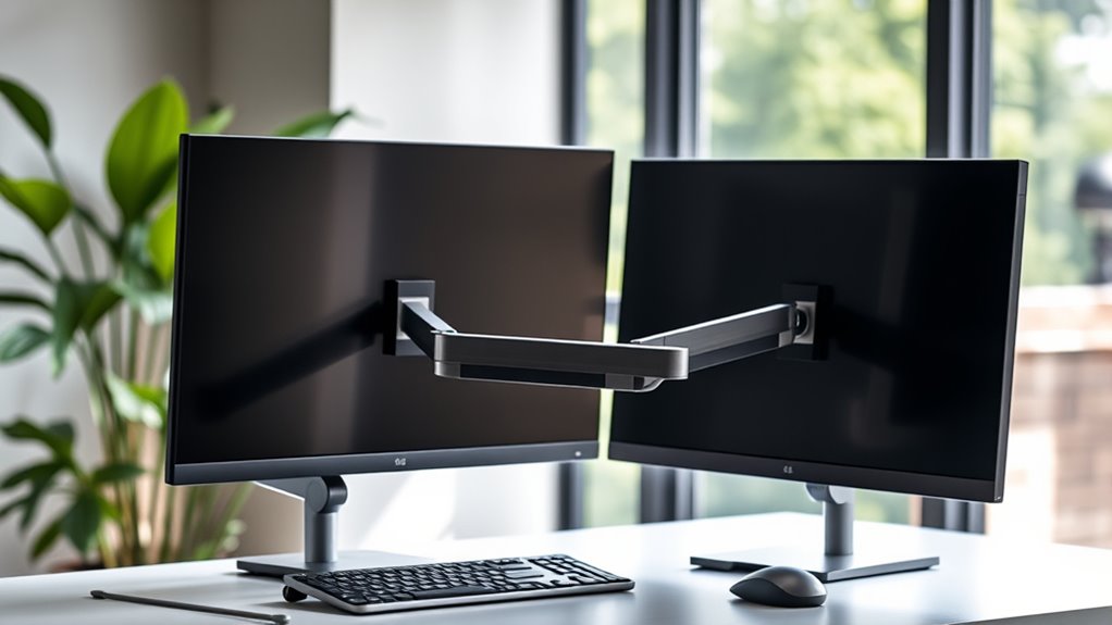 Understanding weight capacity is essential for anyone looking to set up adjustable monitor arms for dual setups. I always make sure the arm’s weight capacity matches or exceeds the combined weight of my monitors. This prevents sagging or instability, which can be frustrating. Typically, monitor arms support weights between 4.4 lbs and 26.4 lbs, so I check that each arm can handle my monitors. Overloading an arm can compromise stability and even damage components, reducing the mount’s lifespan. It’s vital to consider the total weight of my dual monitors and select an arm with sufficient capacity. Lastly, I verify that the mounting hardware and joints are rated for my monitors’ weight to maintain balance and prevent accidental falls.
