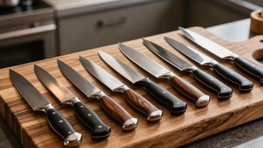 I choose knife handle materials based on comfort and grip. I prefer handles made from rubber or textured synthetic materials because they feel secure and reduce slipping, even when wet. Wooden handles are also nice, offering warmth and a natural feel, but I guarantee they’re well-maintained to prevent cracking. Ultimately, I look for a handle that fits comfortably in my hand and provides good control during extended use.