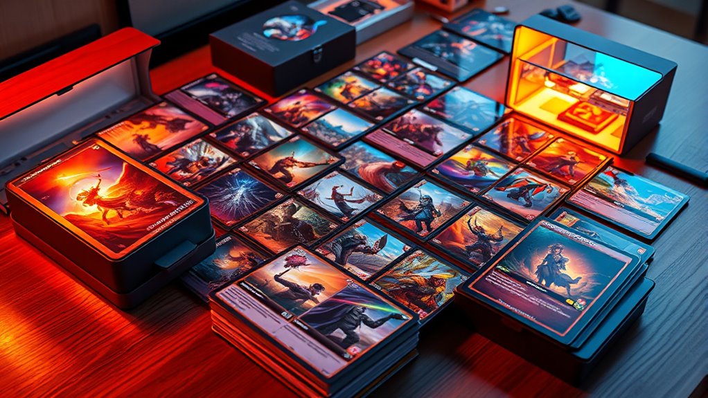 If you’re looking to elevate your deck collection in 2025, I recommend exploring top trading card games like Magic: The Gathering, Pokémon, and Yu-Gi-Oh!. Limited-edition memorabilia, themed bundles, and high-value inserts add unique appeal and value. Storage solutions like deck boxes and large-capacity cases help keep everything organized. If you keep exploring, you’ll discover some of the best options to build a versatile, exciting collection that stands out.