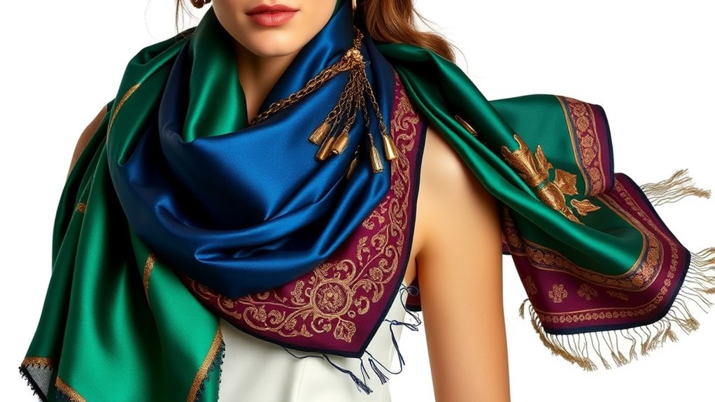 Selecting the right designer scarf or wrap depends heavily on the occasion’s formality and setting. I always consider the event’s dress code, choosing elegant silk wraps for formal gatherings and casual scarves for everyday outings. Color and pattern matter too; I pick shades that complement my outfit and suit the environment, ensuring the accessory enhances rather than clashes. Material and style are key—lightweight silk for warm weather, heavier pashminas for colder days—to stay comfortable. I also evaluate the size and versatility of the wrap, ensuring it can be styled in multiple ways, from draped shawls to tied neckscarves. finally, I match the design and presentation to the event’s tone—opting for understated elegance or bold statements as needed.