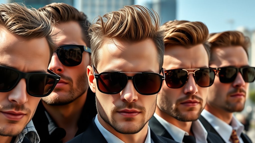 If you’re looking for the 15 best designer sunglasses for men that blend style and protection, I recommend options like Burberry BE4181, Versace black frames, Armani Exchange, and Dolce & Gabbana. These brands offer bold frames, high-quality materials, and UV400 protection for ideal eye safety. Proper fit and authenticity are key, so choose from trusted retailers. Keep scrolling and I’ll share more tips to help you pick the perfect pair that matches your style and keeps your eyes safe.