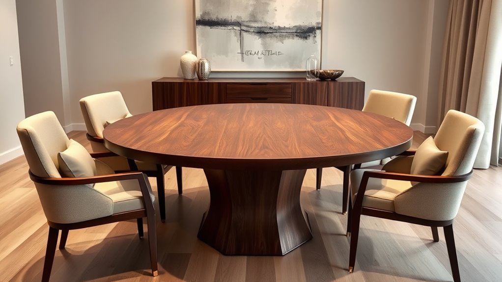 I recommend choosing materials like solid hardwood, such as oak or maple, for durability in dining table sets. These woods resist scratches and dents well, ensuring longevity. Metal frames also add strength and stability, especially when paired with a sturdy wooden top. Avoid cheap particleboard or laminate, which can wear quickly. Investing in quality materials guarantees your table stays beautiful and functional for years to come.