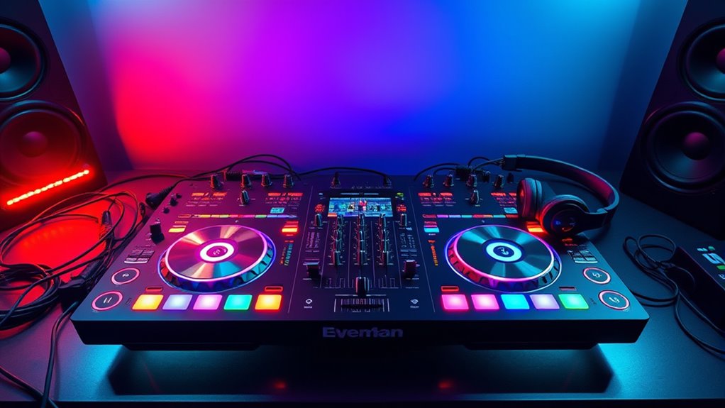 If you’re looking for the 13 best DJ controller setups of 2025, I’ve got you covered. From compact controllers like the Numark DJ2GO2 Touch to advanced all-in-one systems like the Denon DJ SC LIVE 4, there’s something for every skill level and style. I’ll guide you through options supporting various software, connectivity needs, and features that boost your performance. Keep going, and you’ll discover how to pick the perfect setup for your gigs.