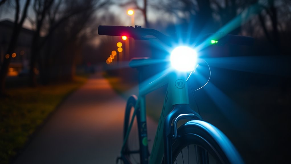 Think of eco-friendly materials in bike lights as the gentle heartbeat of our planet. I’ve noticed many dynamo lighting sets now use sustainable components like recycled plastics and energy-efficient LEDs, making them kind to the environment. These materials not only reduce waste but also guarantee your ride is greener. I believe that choosing eco-conscious gear turns every ride into a small act of kindness towards our Earth.