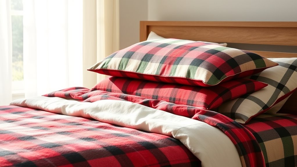 Choosing the right design and pattern for your flannel sheets can really enhance your bedroom’s look and feel. I recommend selecting patterns or colors that complement your existing decor and reflect your personal style. Classic plaids, floral prints, or solid colors are versatile options. Think about seasonal designs—cozy winter patterns or lighter, neutral prints for year-round use. Durability matters, so look for prints that resist fading and pilling through multiple washes to keep your sheets vibrant. Decide whether you want patterned sheets for visual interest or plain designs for a minimalist vibe. Also, consider the pattern size and placement to match your bed size and aesthetic preferences, ensuring a balanced, harmonious appearance that makes your space inviting.