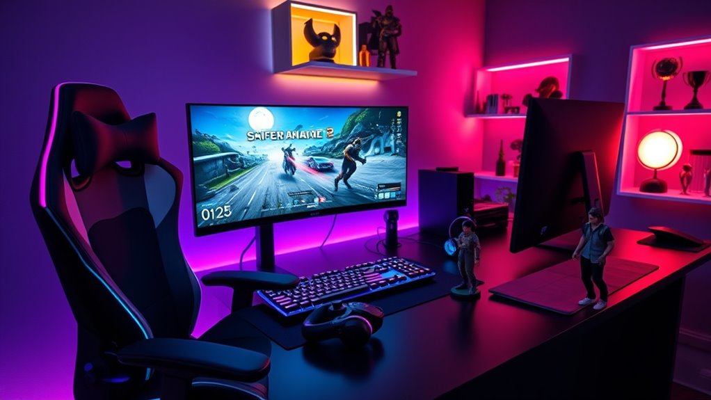 To personalize gaming gifts, I love adding custom touches like engraved controllers or monogrammed mousepads. You can also create a custom gaming setup with personalized decals or artwork that reflect their favorite games or characters. Including a heartfelt note or wrapping the gift in themed packaging makes it extra special. These thoughtful details show you put effort into making the gift unique and memorable for the gamer in your life.
