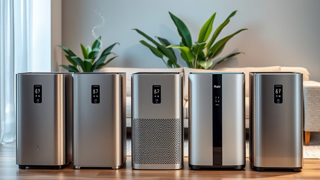 Smart control features have become essential in high-end air purifiers because they allow me to manage and monitor my device conveniently from anywhere. With app integration, I can track air quality in real-time and adjust settings remotely, ensuring my home stays allergen-free. Voice command compatibility with Alexa or Google Assistant lets me control the purifier hands-free, adding convenience. Many models automatically adjust fan speeds based on detected air quality, optimizing purification without manual input. Advanced options like customizable schedules, geofencing, and filter lifecycle alerts via mobile apps give me added control and peace of mind. These smart features help me maintain a healthier indoor environment effortlessly, making high-end air purifiers not just effective but also incredibly user-friendly.