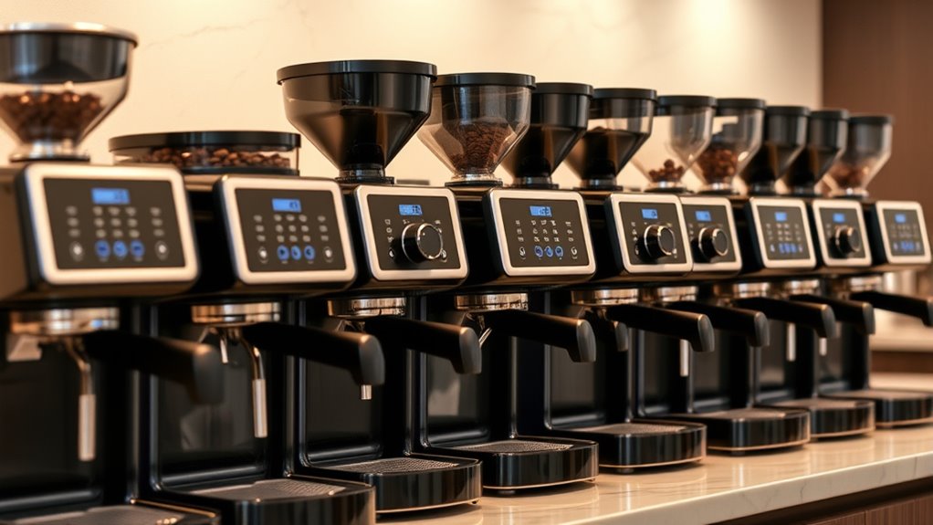 High-end coffee makers with grinders prioritize the quality and precision of their grinding mechanisms, as these directly influence the flavor and consistency of your brew. Most feature conical or flat burr grinders, which produce more uniform grounds than blade grinders, ensuring better extraction. Multiple grind size settings, ranging from 8 to 25 levels, give you fine control over coarseness, allowing customization for different brewing methods. Some premium models even offer automatic adjustments based on your preferred brew strength or drink type, optimizing flavor extraction. The quality of the grinder also affects noise levels; higher-quality burrs operate more quietly during use. Adjustable grind settings enable me to tailor the grind to specific beans and taste preferences, ultimately elevating the overall quality and consistency of each cup.