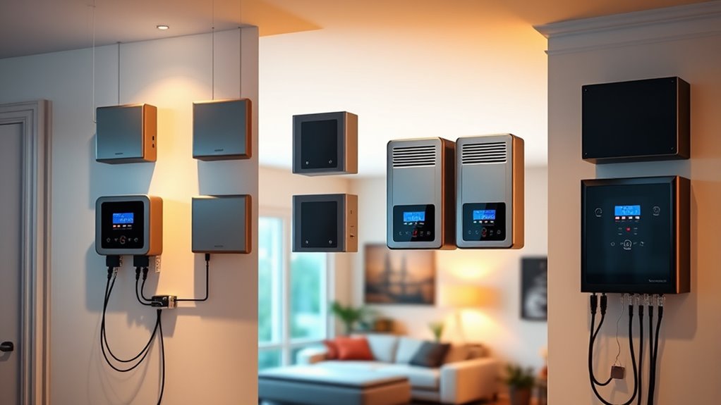 Selecting a high-end home battery backup system requires careful consideration of its maintenance needs to guarantee long-term reliability. Most systems use advanced lithium-based batteries, like LiFePO4, which can last over a decade with minimal upkeep. Regularly monitoring the system via software helps catch potential issues early and extends lifespan. Many batteries include automatic safety features—overcharge and over-discharge protections—that reduce manual intervention. Battery replacement procedures vary: some allow simple DIY swaps, while others require professional service due to complexity or warranty terms. Additionally, maintaining proper environmental conditions—such as ideal temperature and humidity—is vital for battery longevity and consistent performance. Overall, choosing a system with straightforward maintenance helps guarantee reliable operation and peace of mind during outages.