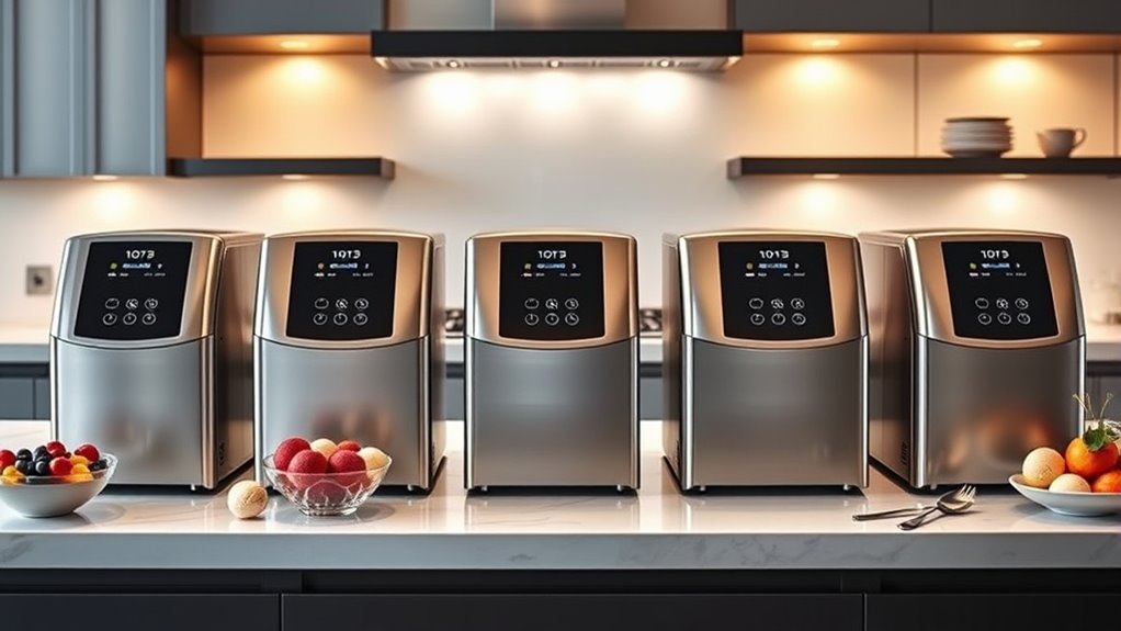 Imagine your ice cream maker as a well-oiled engine—some are more fuel-efficient than others. Premium home ice cream makers are surprisingly energy-conscious, especially models with advanced insulation and efficient compressors. They sip electricity like a fine wine, not a gulp. So, you can indulge in luxury treats without guilt, knowing your machine balances performance and energy use beautifully, making dessert time both delightful and eco-friendly.