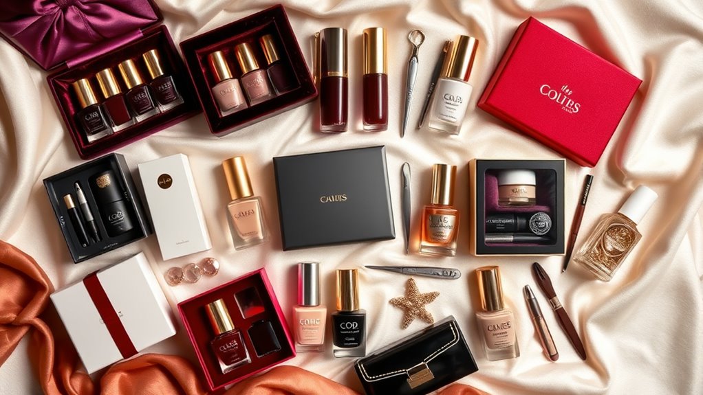 Choosing high-end nail care kits requires careful consideration of tool quality and material, especially since these factors directly influence your grooming experience. I always look for tools made from medical-grade stainless steel, as they guarantee durability and resistance to corrosion. The materials, like hardened or titanium-coated steel, greatly affect the precision and longevity of the tools. I appreciate kits that feature smooth, polished surfaces and ergonomic designs, which provide comfort and control during use. High-quality materials reduce the risk of rust and wear, keeping tools effective for years. Additionally, I find that hand-finishing and polishing elevate the overall quality, ensuring consistent performance and safety. Investing in these aspects makes my manicure experience truly luxurious.