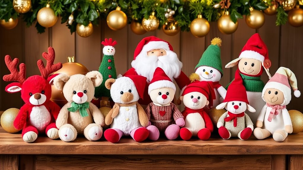 When choosing Jellycat Christmas items, I consider factors like age appropriateness and seasonal themes to guarantee the toy is suitable and festive. Material quality and size are also important for safety and comfort, especially for little ones. Finally, I look at the design and details to find a charming piece that captures the holiday spirit.