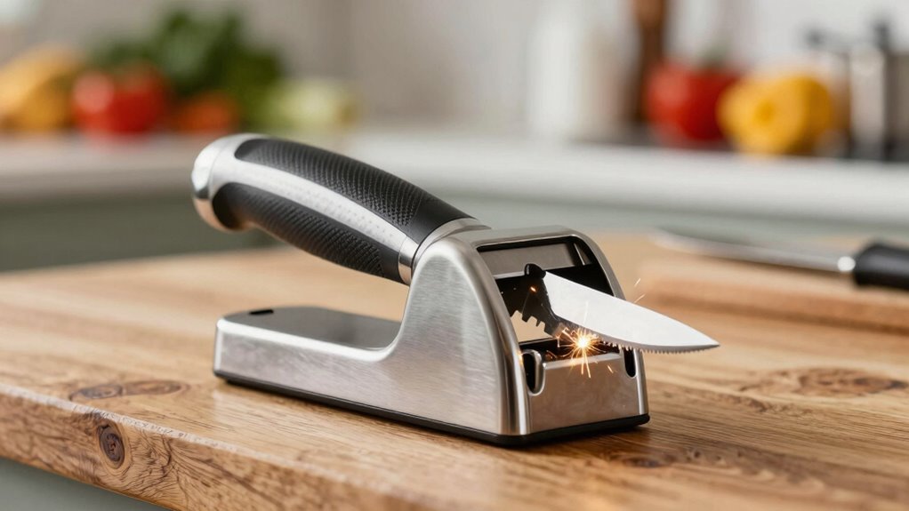 Yes, many sharpeners come with safety features designed for beginners. I’ve seen models with non-slip bases, finger guards, and ergonomic handles that make the sharpening process safer and more comfortable. These features help prevent slips and accidents, giving me confidence when I sharpen my knives. If you’re new to sharpening, look for a model with these safety elements to guarantee a secure and easy experience.