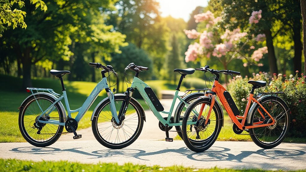 Since comfort and support are essential for enjoyable rides, I pay close attention to features that make my e-bike easier to handle and less tiring. Low-step e-bikes are designed with lower frames, making mounting and dismounting effortless, which reduces strain. Wide, stable tires and a comfortable saddle with suspension help absorb shocks and improve ride quality on different terrains. Adjustable components, like saddle height and handlebar position, allow me to customize the fit for maximum comfort. The step-through frame design minimizes awkward leg lifts, making riding safer and more comfortable, especially with limited flexibility. Ergonomic features, such as padded grips and supportive backrests, help me maintain proper posture and reduce fatigue during longer rides, ensuring a more enjoyable experience.