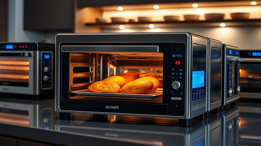 Powerful and practical, premium toaster ovens with air frying capabilities are surprisingly energy-efficient. I’ve noticed they use less energy than traditional ovens, thanks to faster cooking times and targeted heating. Plus, their multi-functionality means I get more done with less power. If you’re aiming for gourmet results without guzzling energy, these appliances are a smart, sustainable choice that save both time and electricity.
