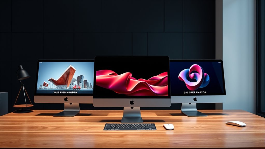 If you’re looking for the best Mac Studios for 3D rendering in 2025, I recommend considering models with powerful hardware like the M4 chip, ample RAM, and fast SSD storage. Compact, energy-efficient, and highly connectable options are ideal for demanding workflows. While some trade-offs exist, such as limited upgradeability, these Macs excel in performance and portability. Stay with me to discover the top picks that balance power, price, and future-proof features.