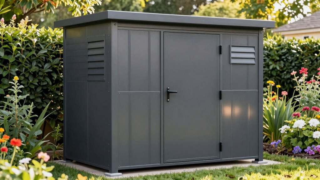 Ensuring proper ventilation in outdoor metal bike sheds is essential for keeping stored items in good condition. Good airflow prevents condensation, which can lead to rust and corrosion on bikes and tools. Strategic placement of vents promotes cross-ventilation, helping to lower humidity levels inside the shed. This airflow also helps dissipate odors and moisture, maintaining a dry, fresh environment. Metal sheds with built-in ventilation features can markedly reduce the risk of mold growth and material degradation over time. When choosing a shed, consider the size and placement of vents carefully—too few or poorly positioned vents won’t provide adequate airflow, but too many could compromise security or stability. Proper ventilation is a key factor in ensuring your shed remains durable and your belongings stay protected.