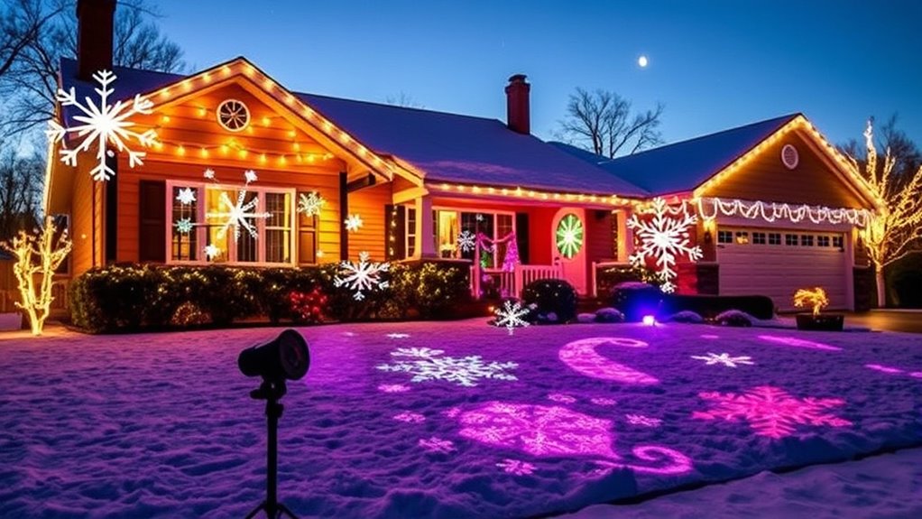 If you want to make your holidays truly shine, I recommend checking out the best outdoor Christmas light projectors that offer vibrant, weatherproof effects like snowflakes, stars, and laser patterns in red, green, and blue. Many models feature remote controls, timers, and adjustable angles to customize your display easily. From snowflake patterns to large-area projections, these options create magical outdoor scenes. Keep exploring to find the perfect projector that fits your style and space.