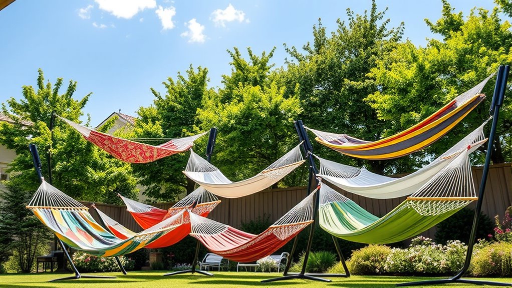 Just like Huck and Jim found their peaceful escape on the river, finding the perfect outdoor hammock with stand can transform your backyard into a personal retreat. Whether you crave solitude or shared comfort, these options promise relaxation and convenience. Remember, the right hammock isn’t just furniture—it’s your own little island of tranquility amid life’s chaos. So go ahead, pick one and let your worries drift away, just like a leaf on a gentle stream.
