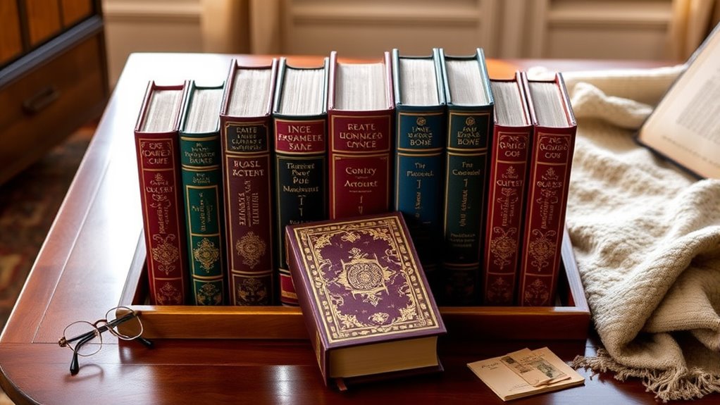 You can personalize a book box set by adding a heartfelt note, including custom bookmarks, or wrapping each book in unique paper. I love engraving a special message on the inside cover or choosing editions with artwork that resonates with the recipient’s taste. Incorporate small surprises like themed accessories or photos to make it truly personal. These touches turn a great gift into a memorable, cherished keepsake.