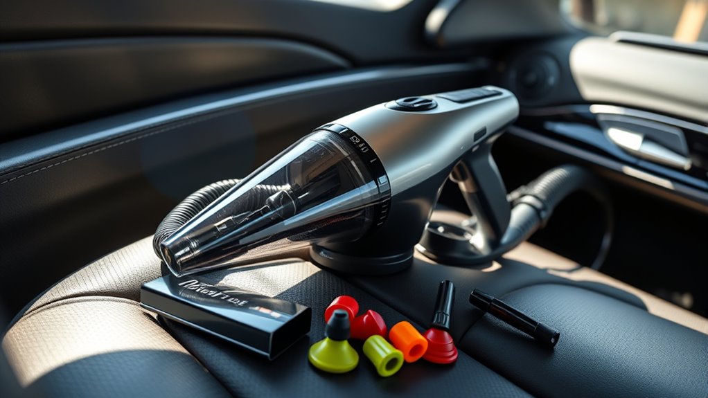 When selecting a premium car vacuum, portability and weight are essential factors that can make your cleaning routine more efficient and comfortable. A lightweight vacuum, under 2 pounds, boosts maneuverability and reduces fatigue during long cleaning sessions. Compact designs with dimensions less than 10 inches easily fit into glove compartments or storage bins, enhancing convenience. Ergonomic handles ensure a comfortable grip, making one-handed operation simple and less tiring. Cordless models eliminate the hassle of tangled cords and limited reach, perfect for quick, versatile cleaning. Additionally, carrying cases or storage bags help organize accessories and facilitate transportation, especially when you’re on the go. Prioritizing these features guarantees a hassle-free experience, saving time and effort while keeping your car spotless.