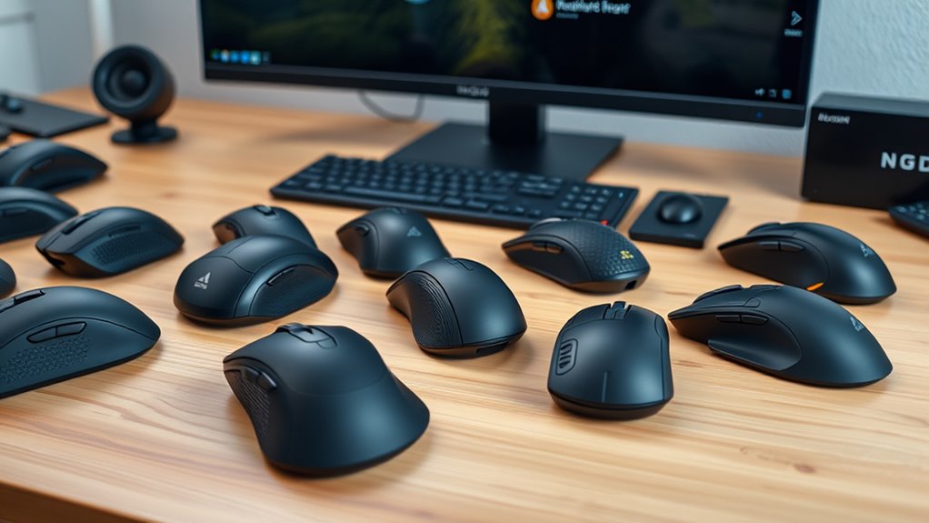 Choosing a premium ergonomic mouse requires careful attention to design features that support comfort and precision. I look for a shape that promotes a natural hand position, reducing wrist twisting and muscle tension during long hours. Features like vertical or handshake designs help keep the wrist in a neutral posture, lowering the risk of strain. Adjustable DPI settings and customizable buttons allow me to tailor control precisely to my tasks, enhancing accuracy. High-quality materials and textured surfaces improve grip comfort and prevent slipping, especially during extended use. The overall shape and size should fit comfortably in my hand, supporting different grip styles and reducing fatigue. A well-designed ergonomic mouse not only boosts productivity but also safeguards my health during hours of focused work.