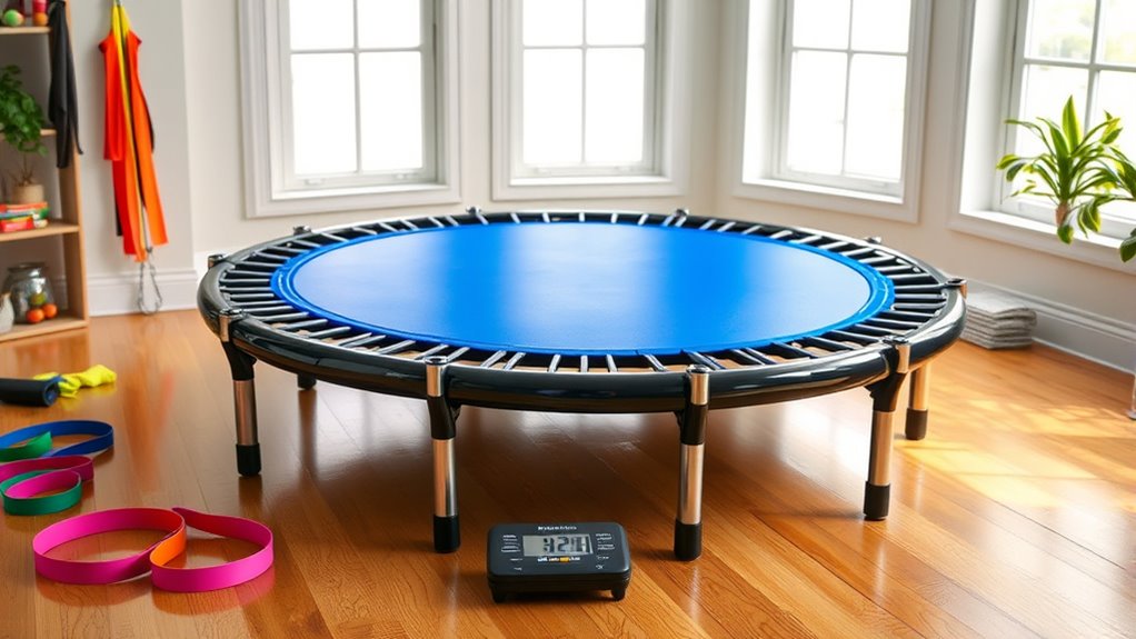 Adjustable components on a fitness trampoline, like tension cords and handlebar height, give you the ability to tailor your workout to your needs. These features let you modify the level of support and intensity, making your exercise routine more effective and comfortable. With multiple adjustable settings, you can switch between low-impact recovery sessions and high-impact cardio, depending on your goals. Being able to easily modify tension and handlebar height also promotes proper ergonomics, reducing strain on your joints and preventing injuries. Plus, these customizable features ensure the trampoline adapts as your fitness level evolves, offering long-term versatility. Overall, adjustable components maximize comfort, safety, and functionality, making your trampoline a valuable investment for consistent, personalized workouts.