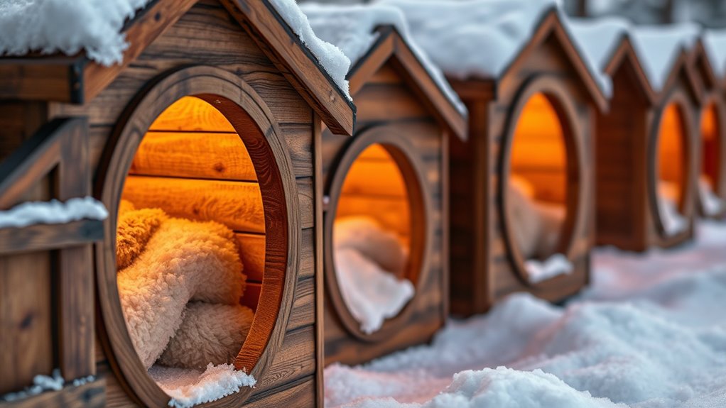Choosing the right insulation materials is essential for guaranteeing your outdoor pet stays warm and comfortable in cold weather. High-quality options like foam, reflective foil, or multi-layer systems effectively trap heat and prevent cold transfer from outside. Durable materials such as weatherproof fabrics, heavy-duty plastics, or insulated wood help maintain a stable internal temperature while resisting moisture, mold, rot, and UV damage. The thickness and density of insulation layers directly influence the shelter’s ability to retain warmth during extreme cold, so opt for thicker, denser options when possible. Reflective surfaces or foil linings can bounce your pet’s body heat back inside, boosting overall warmth. Investing in well-insulated, resistant materials ensures your pet’s shelter remains cozy and functional through harsh winter conditions.