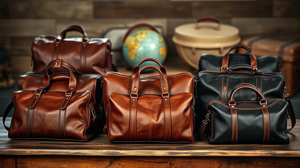 While I’m packing for a weekend trip, I always pay close attention to the design and style of my premium leather duffle bag. I love how a well-crafted bag blends functionality with aesthetics, featuring sleek lines and a timeless appeal. Elements like distressed finishes and polished hardware add character, making it easy to match with any travel outfit. The shape should balance capacity and portability, ensuring it’s spacious enough for my essentials yet easy to carry. I appreciate classic design cues like reinforced handles and durable stitching, which not only enhance the bag’s premium look but also guarantee it ages gracefully. Choosing a stylish duffle bag elevates my travel experience while keeping me organized and fashionable.