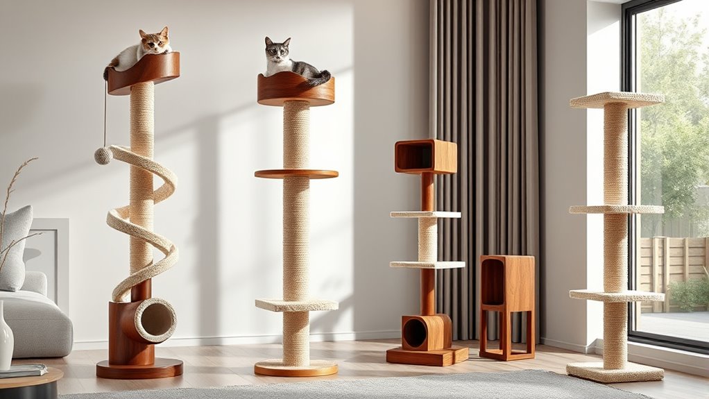 If you’re searching for the 14 best premium luxury cat scratching posts that blend style and function, I’ve got you covered. I focus on options crafted from durable natural materials like sisal, with sleek designs that fit seamlessly into modern homes. These posts offer stability, engaging toys, and tall structures for full-body stretches, ensuring active cats stay satisfied while protecting your furniture. Keep exploring, and you’ll discover details that help you choose the perfect one for your feline friend.