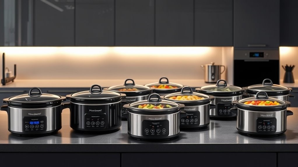 Ever wondered how to make your slow cooker experience as effortless as possible? The key is choosing a model with intuitive digital controls and a clear display, so programming becomes straightforward. Look for devices with easy-to-use connectivity features like app control and remote monitoring that require minimal setup—this keeps things simple. Opt for slow cookers with preset functions and customizable options, reducing the learning curve, especially for beginners. Cleaning should be a breeze, so prioritize models with dishwasher-safe parts and removable accessories. Ultimately, consider safety features such as automatic shut-off and alerts, which boost confidence and prevent mishaps. These factors combine to make your slow cooking experience smarter, easier, and more enjoyable every time.