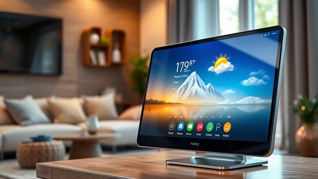 A smart display’s ability to seamlessly connect with other devices considerably enhances its functionality in a smart home setup. To guarantee smooth integration, I look for models supporting Zigbee, Thread, Matter, and Alexa Smart Home protocols, which guarantee compatibility with a wide range of devices. It’s also important that the display can connect with existing ecosystems like Apple HomeKit, Google Home, or Samsung SmartThings if I already use them. Many premium displays include built-in hubs or act as control points, eliminating the need for extra hubs. I also verify that sensors, cameras, lights, and thermostats can be managed centrally through the display. Finally, I consider whether the device can receive firmware updates and support new standards, ensuring it stays compatible long-term.