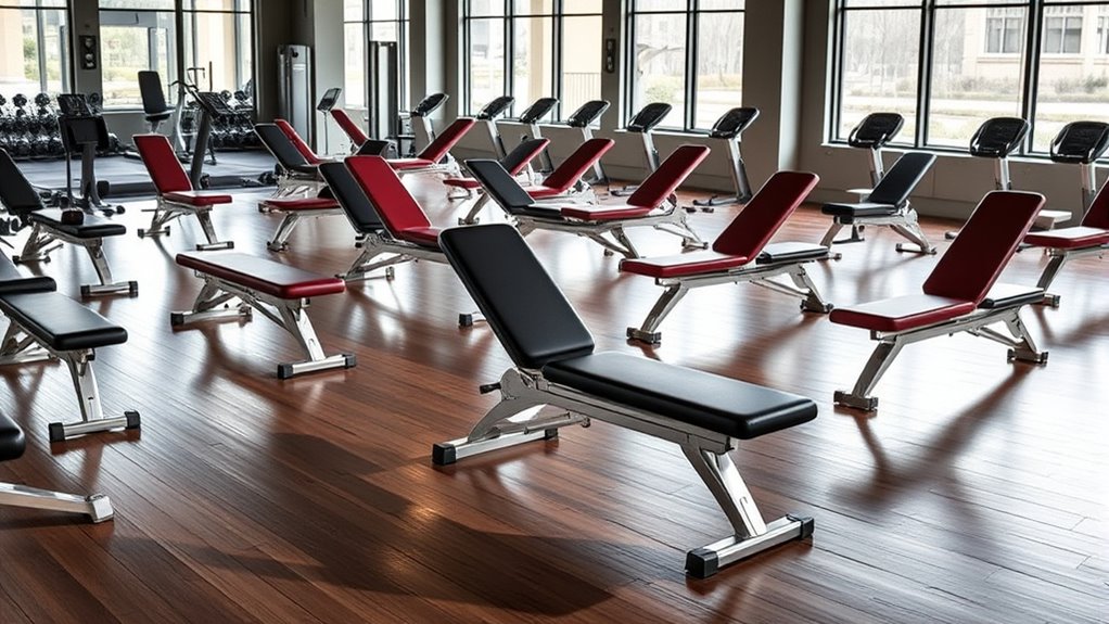 While many factors contribute to selecting the right weight bench, adjustability and versatility stand out as essential elements for effective strength training. I’ve found that a versatile bench should offer multiple positions, like incline, decline, and flat, to target various muscle groups. The number of adjustment options, ideally between 7 to 10 backrest angles, greatly expands your workout variations. I also appreciate quick and secure adjustment mechanisms, such as ladder-style or lock-in pins, which enhance safety and convenience during changes. Additionally, a bench that supports accessories, like leg developers or preacher pads, can really diversify your routine. Finally, a stable adjustment system is fundamental to prevent wobbling, ensuring consistent support no matter the configuration.