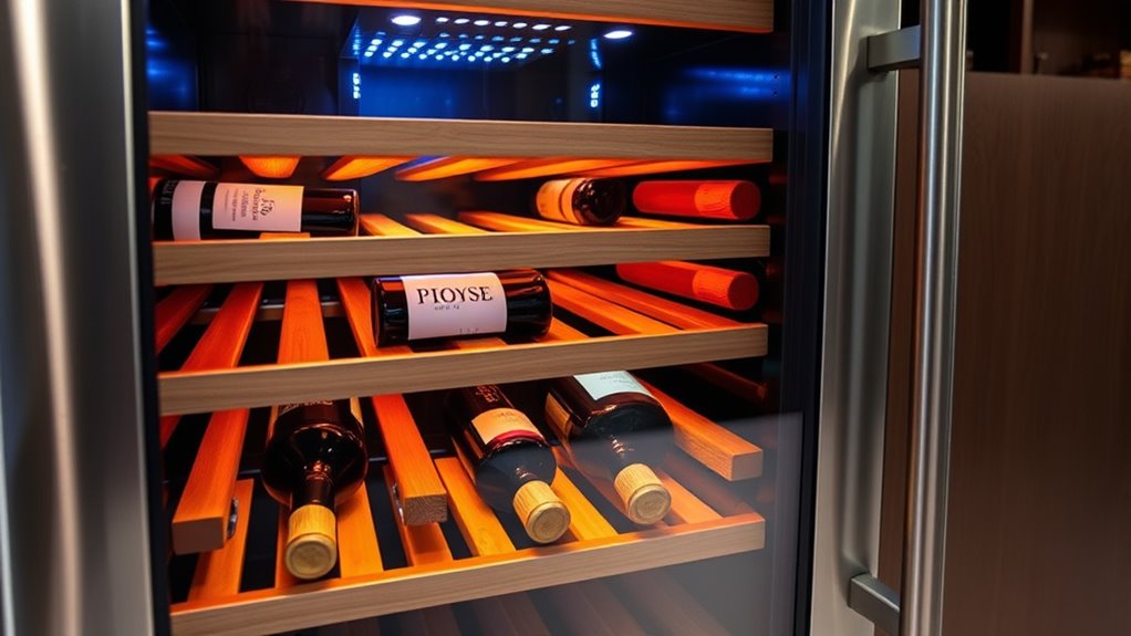 Choosing the right storage capacity is essential for growing your wine collection without outgrowing your refrigerator. You want a unit that can hold your current bottles and accommodate future additions, with options ranging from 8 to over 200 bottles. Adjustable or removable shelves allow you to customize the layout for different bottle sizes, including magnums or larger champagne bottles. The material and design of shelves matter—wooden ones help reduce vibration, while metal or wire racks are easier to clean and flexible. Look for shelves that glide smoothly and stay secure, preventing bottles from shifting or falling. Additionally, specialized racks or compartments can organize wines by type or temperature zone, making access easier and ensuring excellent preservation.