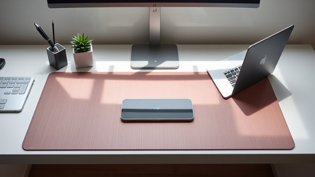 Choosing a smart desk mat with wireless charging isn’t just about aesthetics or features; stability is crucial too. A stable, non-slip base ensures that the mat stays securely in place, especially during intense work or gaming sessions. I find that materials like textured rubber or silicone provide excellent grip on various surfaces like wood, glass, or ceramic. This design not only keeps the mat positioned correctly but also maintains the alignment of wireless charging zones, ensuring reliable device charging. Plus, a non-slip feature enhances safety by minimizing the risk of the mat sliding off the desk while I handle multiple devices. To gauge effectiveness, I always check user reviews and product specs for details on grip strength and anti-slip materials.