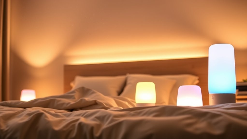 Portability and rechargeability are great, but the real magic of smart night lights lies in their customization and versatility. I always look for night lights that offer adjustable brightness levels and multiple color options, allowing me to tailor the environment to my child’s preferences. Customizable sleep training modes are essential; I love programmable cues for bedtime and wake-up signals that support our routine. Flexible control methods, like remote app access or touch controls, make it easy to adjust settings without disturbing sleep. I prioritize models that allow personalized schedules, including timers and preset routines, so they adapt to changing sleep patterns. Finally, devices that incorporate multiple sensory inputs, like sound and light, help create a comprehensive and adaptable sleep environment.